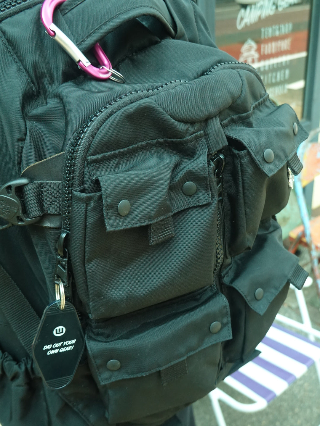 フロントの無数のポケットが特徴的なデザイン。